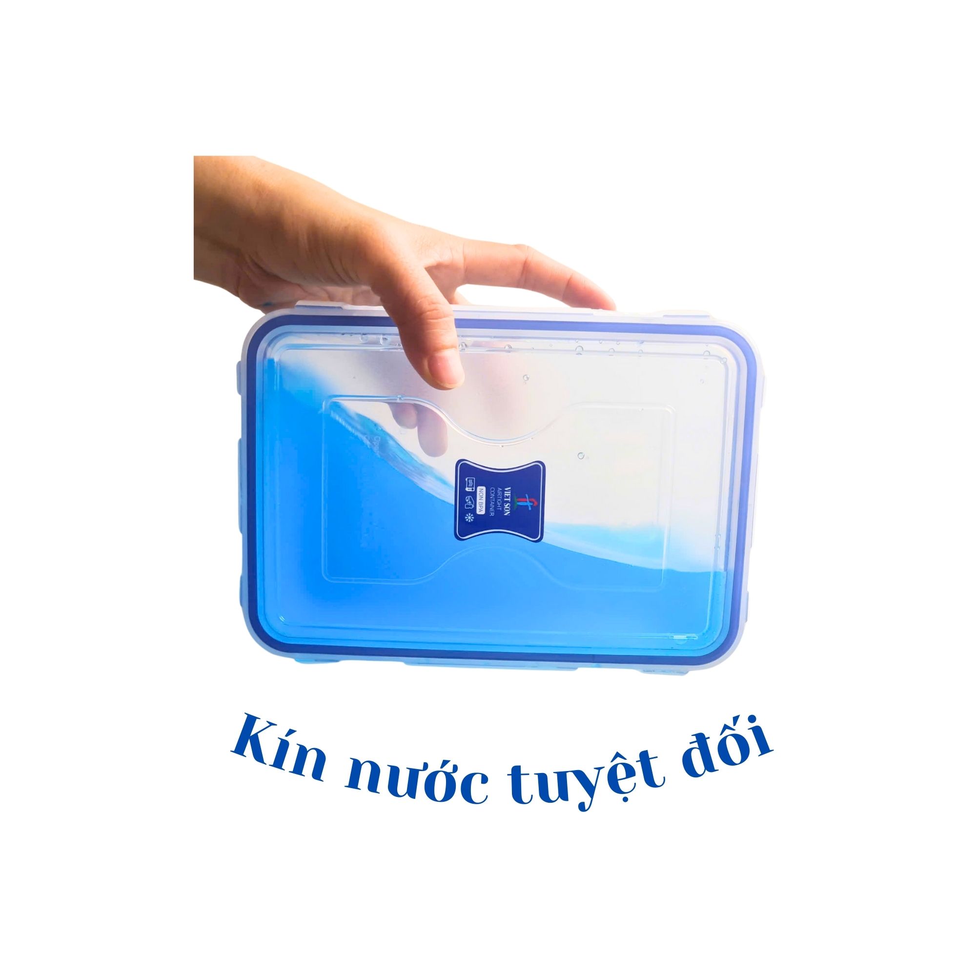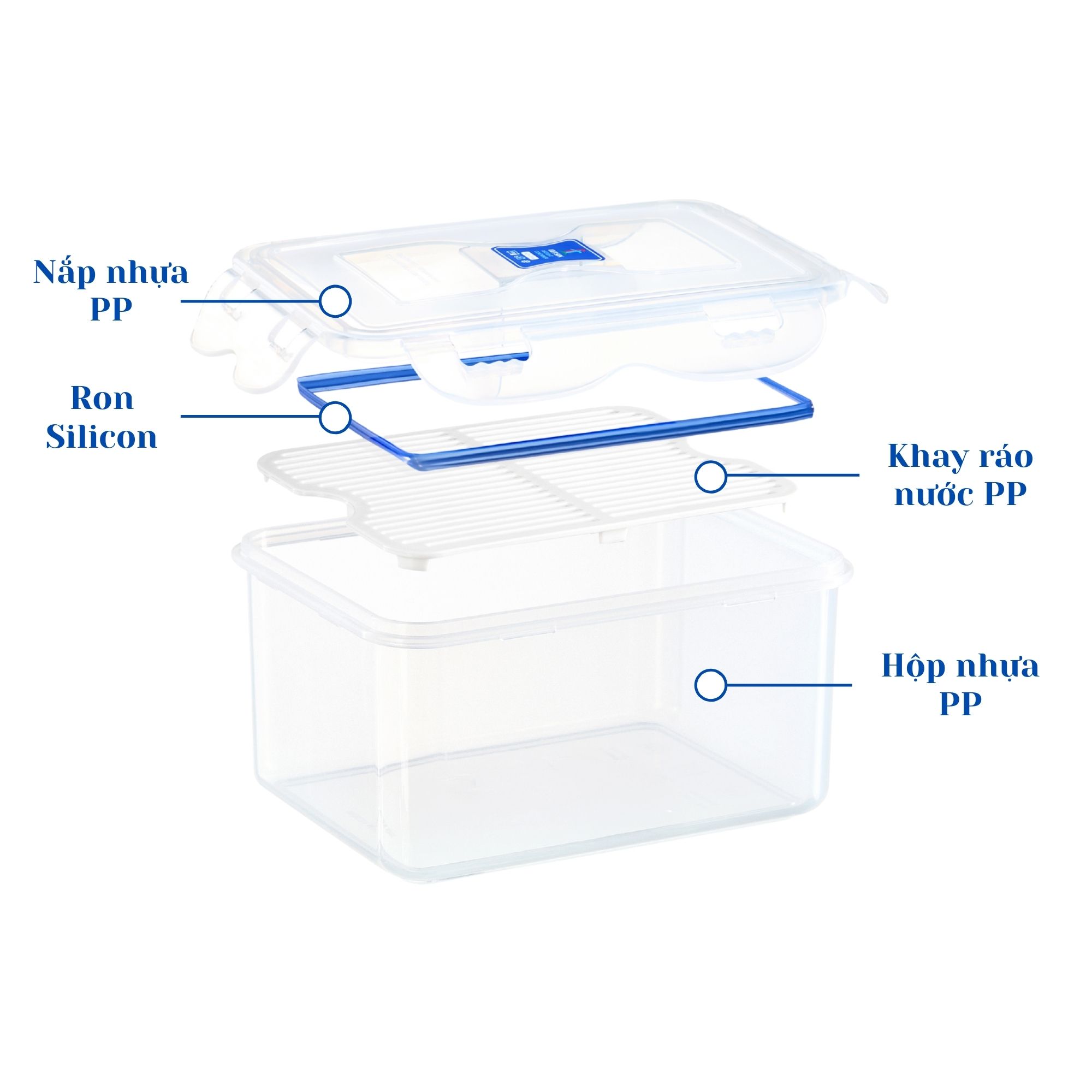 - Đặc biệt, hộp có thiết kế nắp đậy với cấu tạo khóa 4 cạnh kín hơi cùng gioăng Silicone chắc chắn, giúp không để lại mùi khó chịu trong tủ lạnh, không bị tràn hay đổ ra ngoài ngay cả khi hộp bị nghiêng.